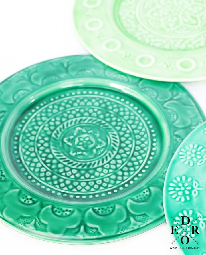 Bringen Sie frische Farben und Stil auf Ihren Tisch mit dem Teller-Set „Marina“. Das Set besteht aus vier kunstvoll verzierten, emailierten Tellern in kräftigen Frühlingsfarben – Hellgrün, Dunkelgrün, Helltürkis und Dunkeltürkis. Jeder Teller aus robustem Metall ist mit einem einzigartigen Muster versehen, das Ihrem Tisch eine elegante und lebendige Note verleiht. Ideal für festliche Anlässe, Sommerfeste oder besondere Feiern. Die glänzende Emailierung sorgt für einen raffinierten Look und macht jedes Mahl zu einem Highlight.